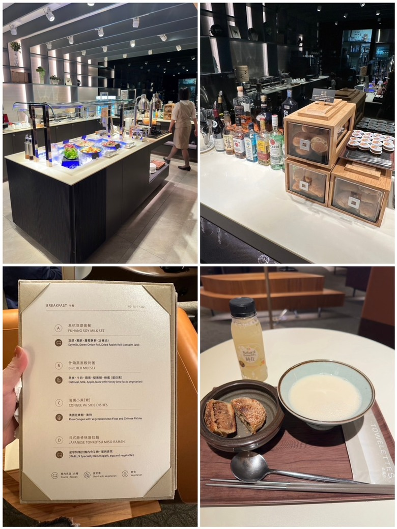 急著出門沒吃早餐,但上飛機又有期待很久的餐點,所以就在貴賓室點了份量比較小的阜杭豆漿,蘿蔔酥餅一上桌立刻掃光,越吃越涮嘴,我怕再點下去就沒有肚子會沒有空間吃飛機餐,就去拿沙拉來吃,自助吧的青菜都很新鮮,也都整理的很乾淨