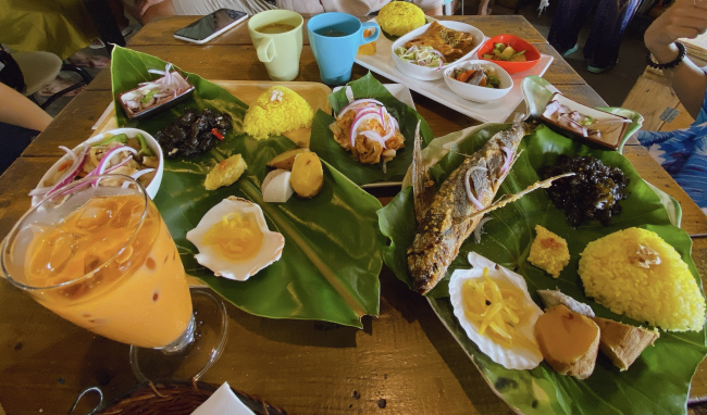 內容物: 炸飛魚 地瓜🍠 薑黃飯🍚 涼拌木耳/小菜們 泰式奶茶🥤